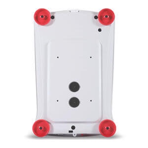 Base metálica, carcasa superior de plástico, plato de acero inoxidable extraíble, protector de vidrio contra corrientes de aire, gancho para pesaje por debajo integrado, abrazadera de seguridad, bloqueo de calibración y cubierta en uso.